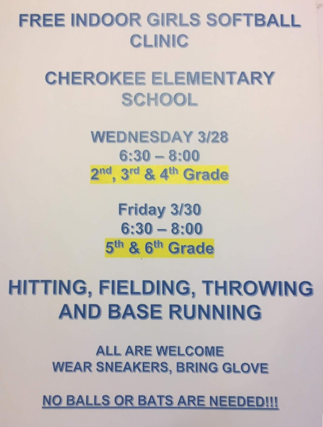 This week I received a request from a Mr Brennan, of Nesconset, New York, asking me to get the word out about a free indoor girls softball clinic at the Cherokee Elementary School (?).